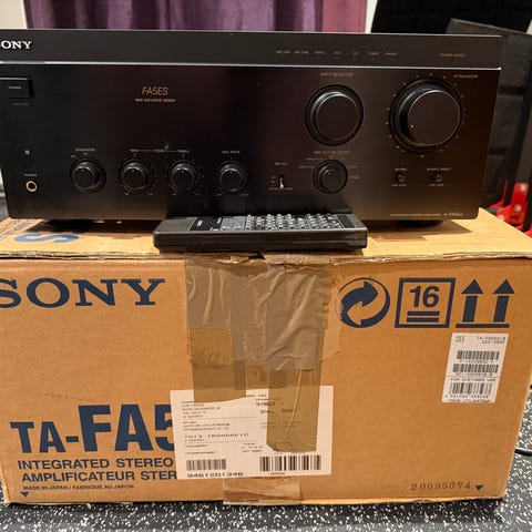 Sony forsterker i ES serien med flere innganger og utganger for lydtilkobling. Enheten har en svart finish og er designet for å forbedre lydopplevelsen ved bruk med ulike lydkilder og høyttalere.