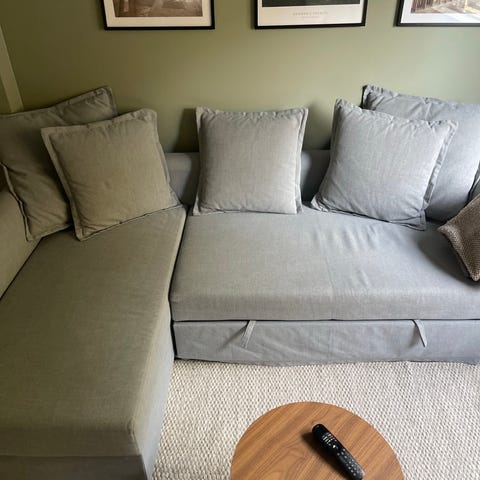 Dette er en praktisk og komfortabel sofa som enkelt kan gjøres om til en seng. Den har også et innebygd oppbevaringsrom til sengetøy, noe som er veldig plassbesparende.