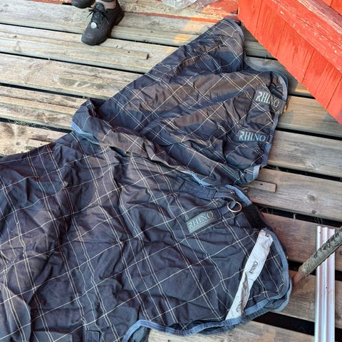 Selger et nesten nytt Rhino regndekken. Kjøpt nytt i november. Kun brukt eit par ganger, fremstår som nytt. Er nyvasket med nikwax. Selges kun pga salg av hest. Nypris 2300,- selges for 1800,- eller bud.