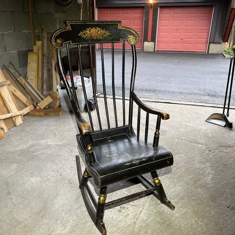Lav antikk gyngestol med brodert sete. Stolen er i fin stand mtp alder, men har ei lita rift i rottingen på undersida av setet. Sjå eige bilete.