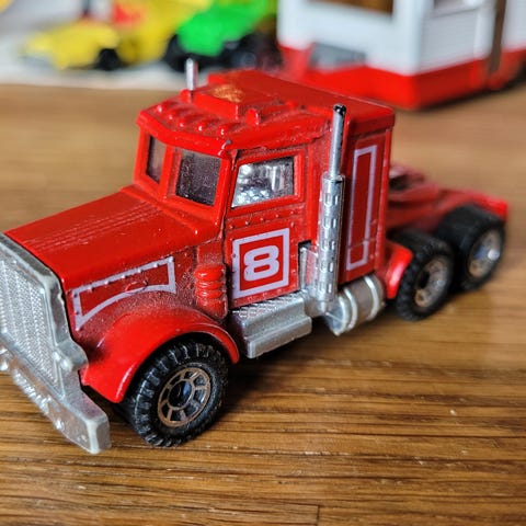 Coca-Cola leketruck med rød lasteplan og hvit lastebil. Inkluderer små svarte flasker med gullfargede detaljer. Lasteplanet har gjennomsiktig deksel og fire hjul.