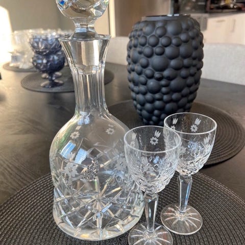 Pen og klassisk serie med krystallglass. Karafell harstjernemønster i bunn. Selges samlet.