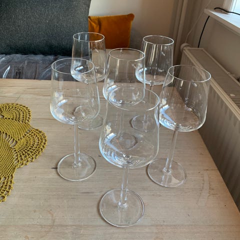 Selger unna 6 stk Essence hvitvinsglass fra Iittala. Brukt, men ingen skader. Trenger litt polering, men kun vasket for hånd. Må hentes.