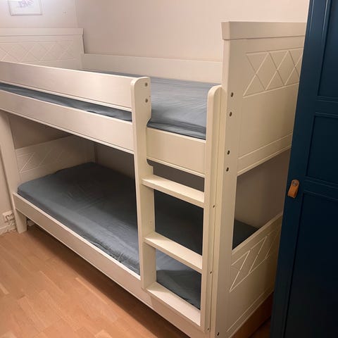 IKEA køyeseng i tre, med plass til to soveplasser. Sengen har en solid konstruksjon med lameller som støtte for madrasser. Passer for barn eller ungdom og er egnet for rom med begrenset gulvplass.