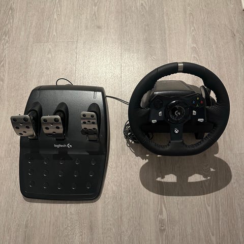 Logitech G920 racingsim med tilhørende pedaler og girspak. Utstyrt med flere knapper og justerbare funksjoner for bruk i bilspill og simuleringer. Pedalene inkluderer gass, brems og clutch. Girspaken har flere girposisjoner for realistisk kjøreopplevelse. Passer til PC og Xbox.