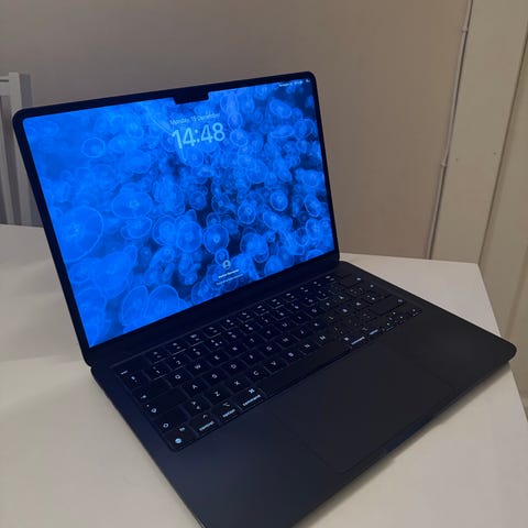 Apple MacBook Air M2 bærbar PC i sølvfarge. Modellen er fra 2022 og har en Apple M2 prosessor. 13,6 tommer.