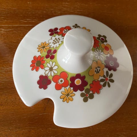 Elvira ble produsert i perioden 1975-78, dekor er underglasert og tåler dermed mer. Selve krukka har ingen anmerkninger, men lokket har en liten feil i glasuren fra produksjonen - se bilder. Forøvrig ingen anmerkninger, nagg/krakelering eller skader.