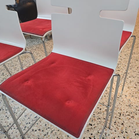 Godt brukte barstoler selges for 100 kr/stk. Har noen bitemerker etter katt som synes, mest på to av dem. Mangler en skru under hvert sete, men merker ingenting av dette. Kan pumpes opp og ned, og er veldig behagelige å sitte på. Høydr: 113 cm når den er helt oppe.