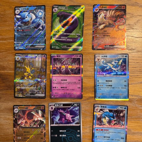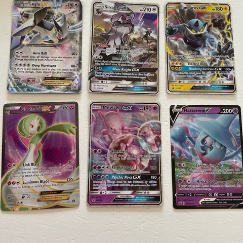 Meowth har små synlige skader rundt hjørnene av kortet, og flere andre har veldig små merker, såvidt synlige