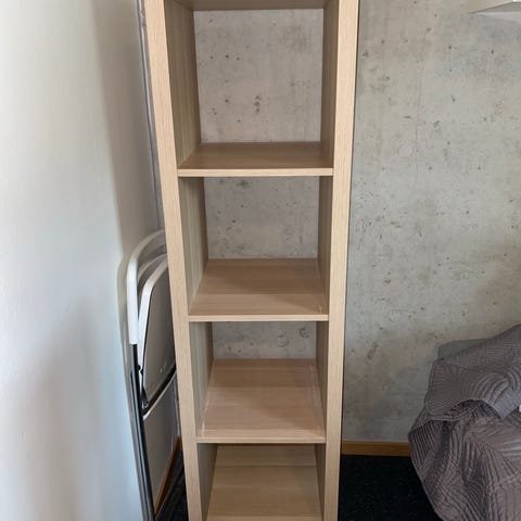 IKEA hylle med flere åpne hyller og to skuffer. Reolen kan brukes til oppbevaring og organisering i ulike rom.