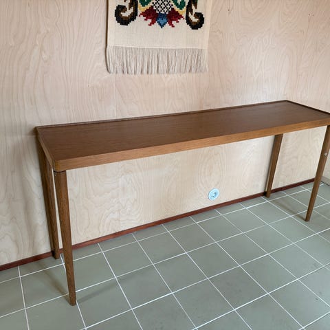 Dansk design, benk laget av heltre, stødig, og designet både for å stå langs en vegg, foran vindu eller frittstående.