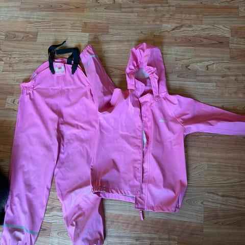 Selger et regnsett med votter fra viking. Vottene er med fleecefor. Regntøyet er lite brukt og fremstår veldig pent. Kjempefin rosa farge.