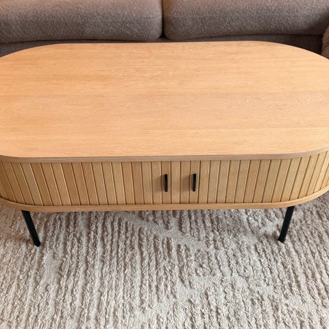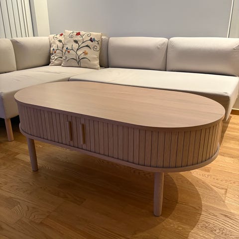 Nola ovalt sofabord med hylle 60x120 H45 cm med 2 sjalusidører hvitoljet eikefiner med metallben svart. Bilder fra nette spør gjerne om du ville ha ekte bilder