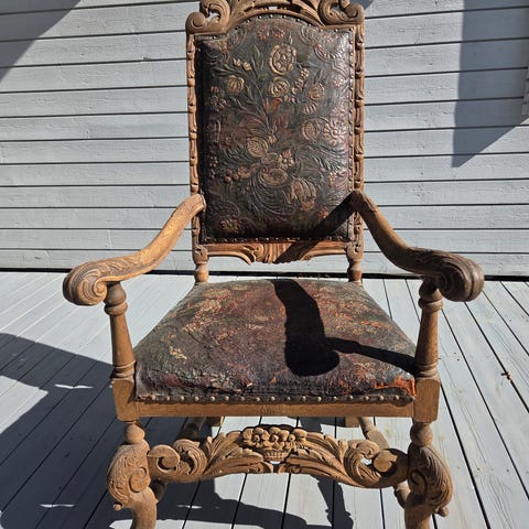 Den tilhørende sittegruppen og stolen kompletterer helheten på en svært elegant måte. Møblene er utført i utskåret treverk med klassiske former og dekorative detaljer, og har et tidstypisk tekstiltrekk som understreker det antikke uttrykket.