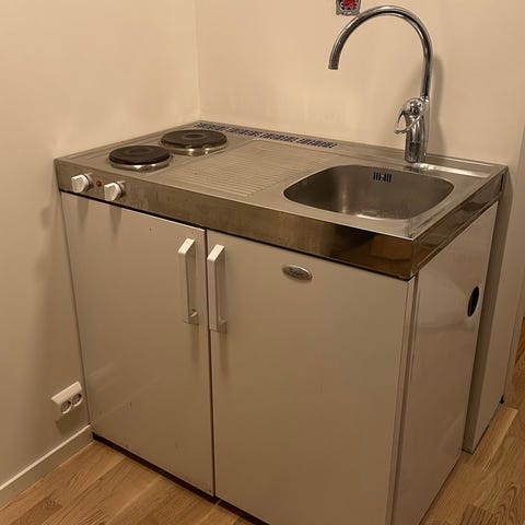 Hybelkjøkken med 2x koketopper, vaskekum og kjøleskap med frysedel.