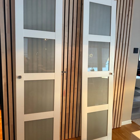 IKEA dør med strukturert overflate i hvit farge. Døren har et bølgemønster. Selger tre hvite og en grå, 100 kr per stk