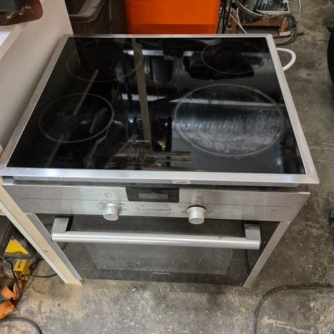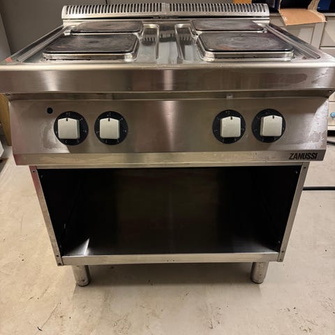 Elektrisk komfyr med fire kokeplater. Overflate i rustfritt stål. Passer for standard kjøkkenbruk.