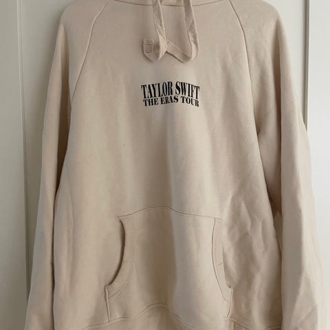 Selger merch fra Taylor Swift sin eras tour. En beige hettegenser og en blå t-skjorte i størrelse large selges sammen. Kjøpt i hennes offisielle nettbutikk. Fra røykfritt hjem uten dyr.