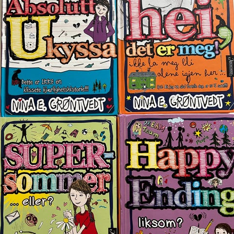 2 bøker fra Nina E. Grøntvedt. "Hei, det er meg!" Boken er god som ny, mens "Happy Ending, liksom?" Ser vi på framsiden at den har blitt brukt.