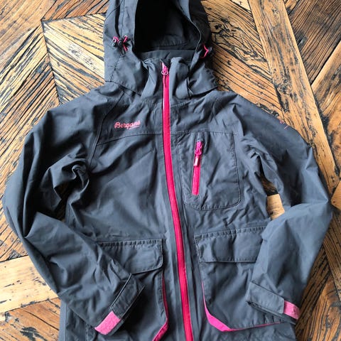 Bergans Ervik youth jakke i str 128 Rosa farge laget av polyamid materiale. Jakken er designet for barn og har funksjoner som hette og glidelåslommer, egnet for utendørsaktiviteter. Den er synlig brukt og selges derfor for 50 kr