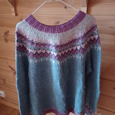 Genser i rett og vrang strikk fra Scarlett i størrelse XL - men liten i størrelsen, mer som L. 50% ull og 50% akryl. Brystvidde 89 cm og lengde 53 cm