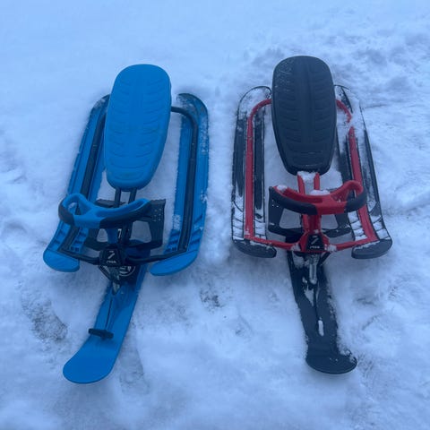 Skiene bak på hver side har en sprekk i midten (se de siste bildene). Det påvirker ikke akingen for de minste så mye. Hvis ønskelig kan "skiene" erstattes med nye da de selges som reservedeler.
