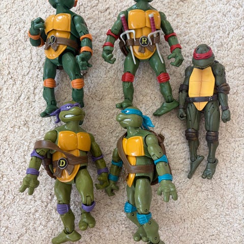 Sønnen min selger 5 stk Teenage Mutant Ninja Turtles-lekefigurer samlet.