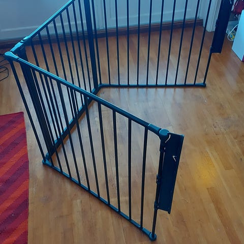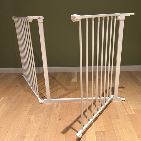 Selger pent brukt tre-delt grind i svart farge til å beskytte barn eller dyr for peisen, dele opp rom osv. Ingen bruksmerker. 2 faste deler og en del som er en dør, kan kobles sammen på forskjellige måter. Kan også utvides eller man kan fjerne deler. Hentes i Plassen.