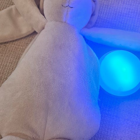 Den er oppladbar og har funksjon som slår seg på automatisk ved lyd/gråt. Myk og trygg for baby.