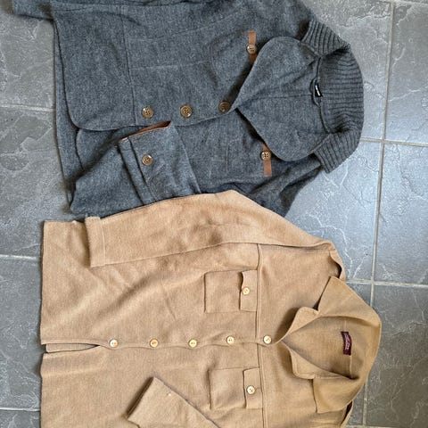 Cardigan sett med kortermet genser med høy hals og jakke med knapper. Fra Gerry Weber, størrelse 40. 45% viskose, 45% polyamid og 15%angora. Brystvidde 100 cm, lengde 56 cm. Settet er ubrukt