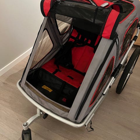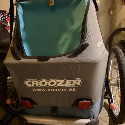 Selger en godt brukt Croozer sykkelvogn for 2 barn. Plass til 2 barn i tillegg til mye bagasje. 2 sykkelfester følger med, i tillegg til 1 lite og 1 stort hjul som kan brukes om man ønsker å trille vognen. Det ene regntrekket mangler festepunkter, ellers er den i fin stand.