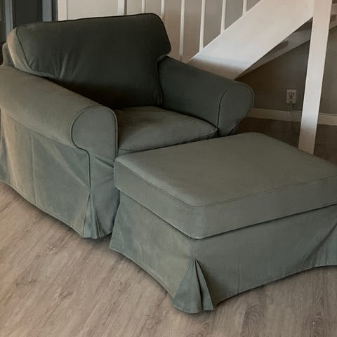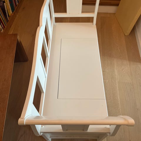 Pent brukt benk med oppbevaring under puten, som fungerer fint til lagring.