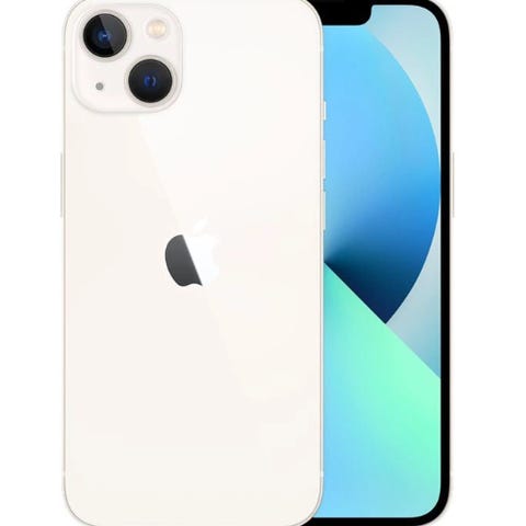 Apple iPhone 13 med 128 GB lagringskapasitet i hvit farge. Mobiltelefon med dobbelt kamerasystem på baksiden og skjerm med liten notch. Designet for personlig bruk.