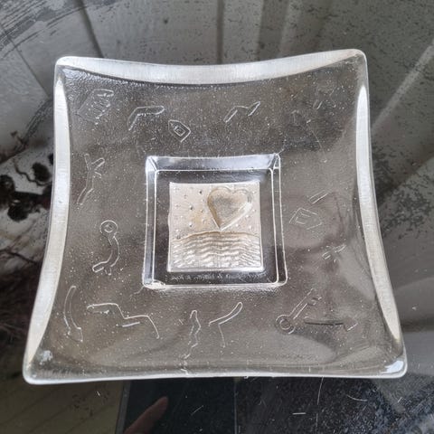 Jeg selger min meget billig da det er noen (4stk) hakk i kanten. Den er likevel super sjarmerende og i en vakker farge.