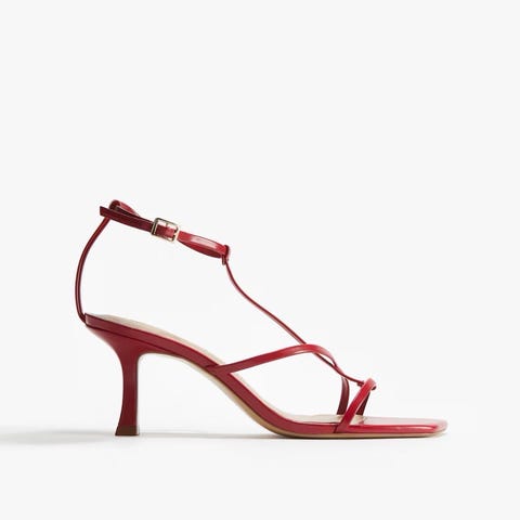 Et par høyhælte sandaler i coated kvalitet med avrundet tå, smal rem over foten og regulerbar ankelrem med metallspenne.