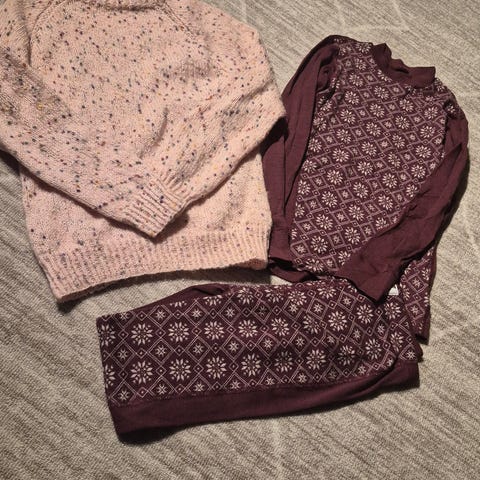 1 stk Janus ull-topp i str. 12 år. 1 stk. Stripete Kari Traa ull-stillongs i str. 10- 12 år. 1 stk. lilla, Aclima ull-stillongs i str. 150. 1 stk. rosa Janus ull-stillongs i str. 10 år. 1 stk. Rosa/gråstripete Safa ull-stillongs i str. 130.