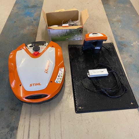 Stihl iMow robotgressklipper for automatisert gressklipping. Produktet inkluderer nødvendige tilbehør som kanttråd og festemidler for installasjon. Designet for vedlikehold av hager og plener.