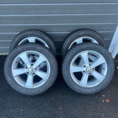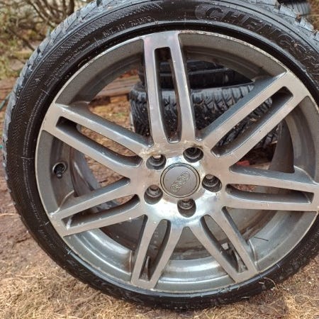 Hjul med piggdekk til Tesla Model S (2016) til slags. Piggdekkene Goodyear er brukt i 3 sesonger.