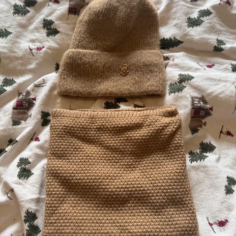 Beige sett med lue og skjerf, laget av polyester. Passer for kvinner eller menn, størrelse S–M. Ideelt for kaldt vær, det holder hodet, ørene, halve ansiktet og nakken varme. Hvis du ikke vil ha det over ansiktet, strekk det bare ut for å holde bare nakken varm