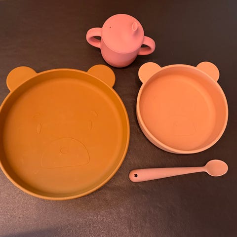 Skålene kan vaskes i maskin og brettet kan tørkes av med en fuktig klut.
