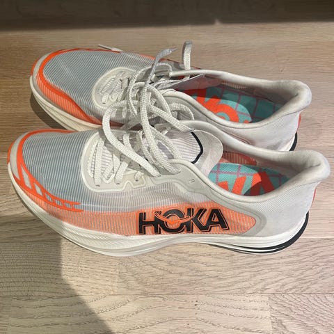 Selges da de er litt for små. Løpt et halvmaraton pluss noen korte turer, max 50 km. Ingen synlige bruksmerker bortsett fra det hvite merket på innersålen.