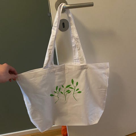Selger handlenett som rommer 18L. Handlenettet er pyntet med eget design. Fokus på gjenbruk og god samvittighet.