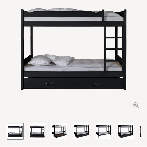 Kan brukes sammen med skjøtestykke som hever avstanden mellom køyene med 25cm, slik som dere ser på bildene. Det følger med en kortere stige om man ønsker å bruke sengen uten ekstra høyde. På bildene med bamser ligger det også en ekstra madrass, så avstanden under vises best på bildet uten bamser.