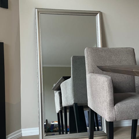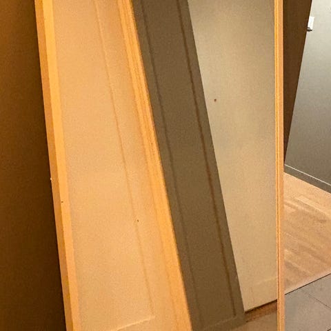 Stort speil som kan stå på gulv eller henges på vegg. Fester for både loddrett og vannrett montering sitter på.
