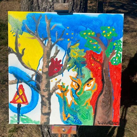 Dus blå bakgrunn, oransje og gule momenter med spennende krakkelering i bakgrunnen som gir den dybde til maleriet. Malte kanter og kan henges rett på veggen. Kan sendes i posten