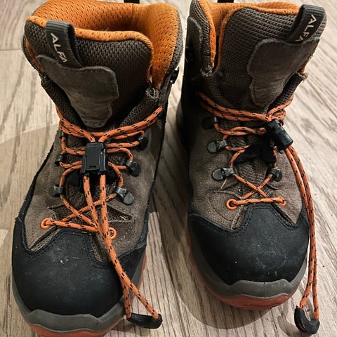 Vibram fottursko i størrelse 37, (37,5) brun/burgunder farge. Skoene har en slitesterk såle med godt grep, egnet for fotturer. Materialet og designet er tilpasset for utendørs bruk og gir stabilitet og komfort under turer.