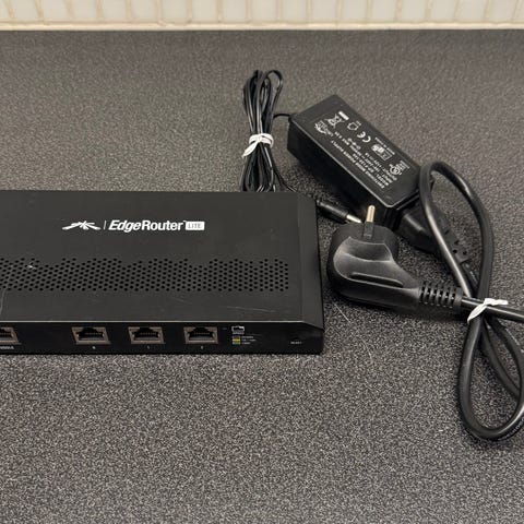 Ubiquiti EdgeRouter ER-X Router med fem Ethernet-porter. Enheten er designet for nettverksstyring og distribusjon, og har et kompakt svart kabinett. Passer til bruk i hjemmenettverk eller små kontornettverk.