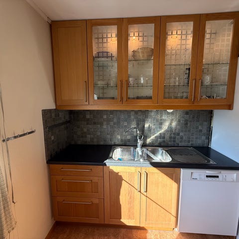 Hjelp - oppussing på gang! Vi selger derfor vår IKEA kjøkkeninnredning med hvite skapdører, inkludert overskap med glassdører og underskap. Benkeplate i tre. Passer for kjøkkenrom med behov for oppbevaring og arbeidsflate. Armatur (kran) er fra 2024 og fronter på skap og skuffer er fra 2023