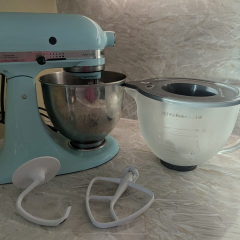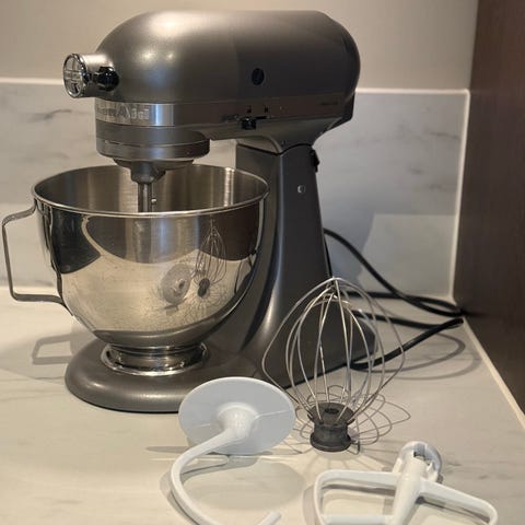 Pent brukt med bolle i rustfrittt stål og visp, mikser etc