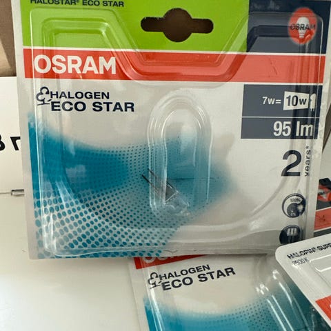 Osram Decostar 51 Star halogenpære med effekt på 35 watt og lysstyrke på 430 lumen. Pæren har en levetid på ca. 4000 timer og er designet for bruk i spotbelysning. Vi har gått over til LED belysning, har 15 pærer(7 stykk 2 pk) til salgs for en gunstig pris. Nypris 65,- pr eske.